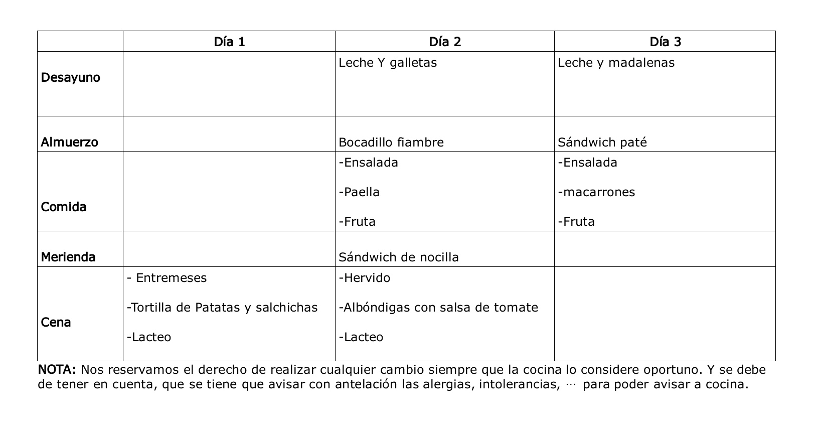 MENÚ Y ACTIVIDADES QUE SE LLEVARÁN A CABO DURANTE LA ESTANCIA.